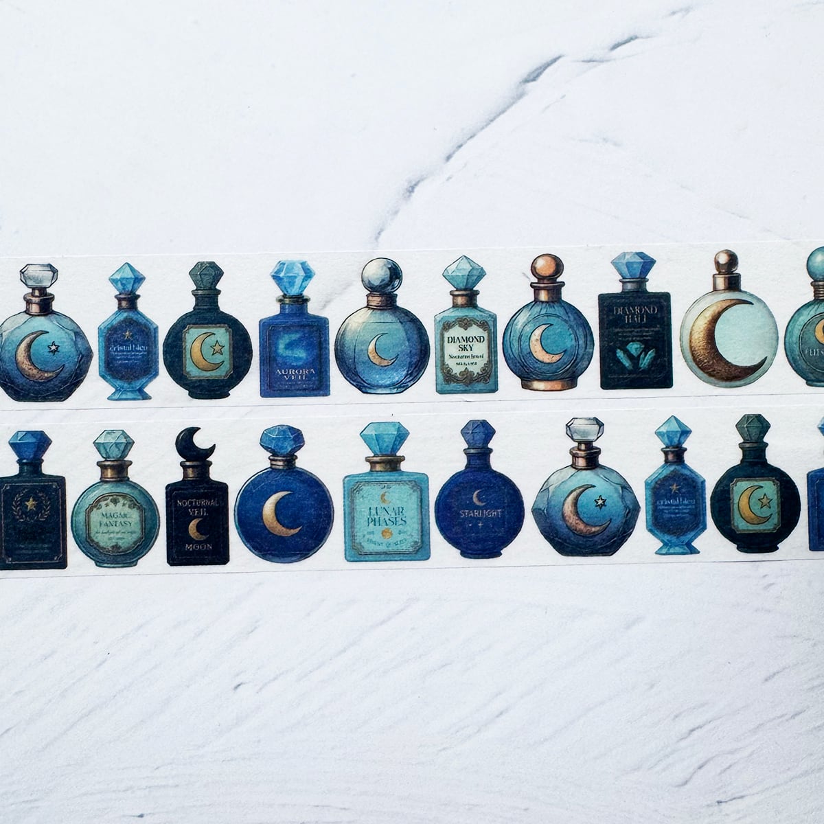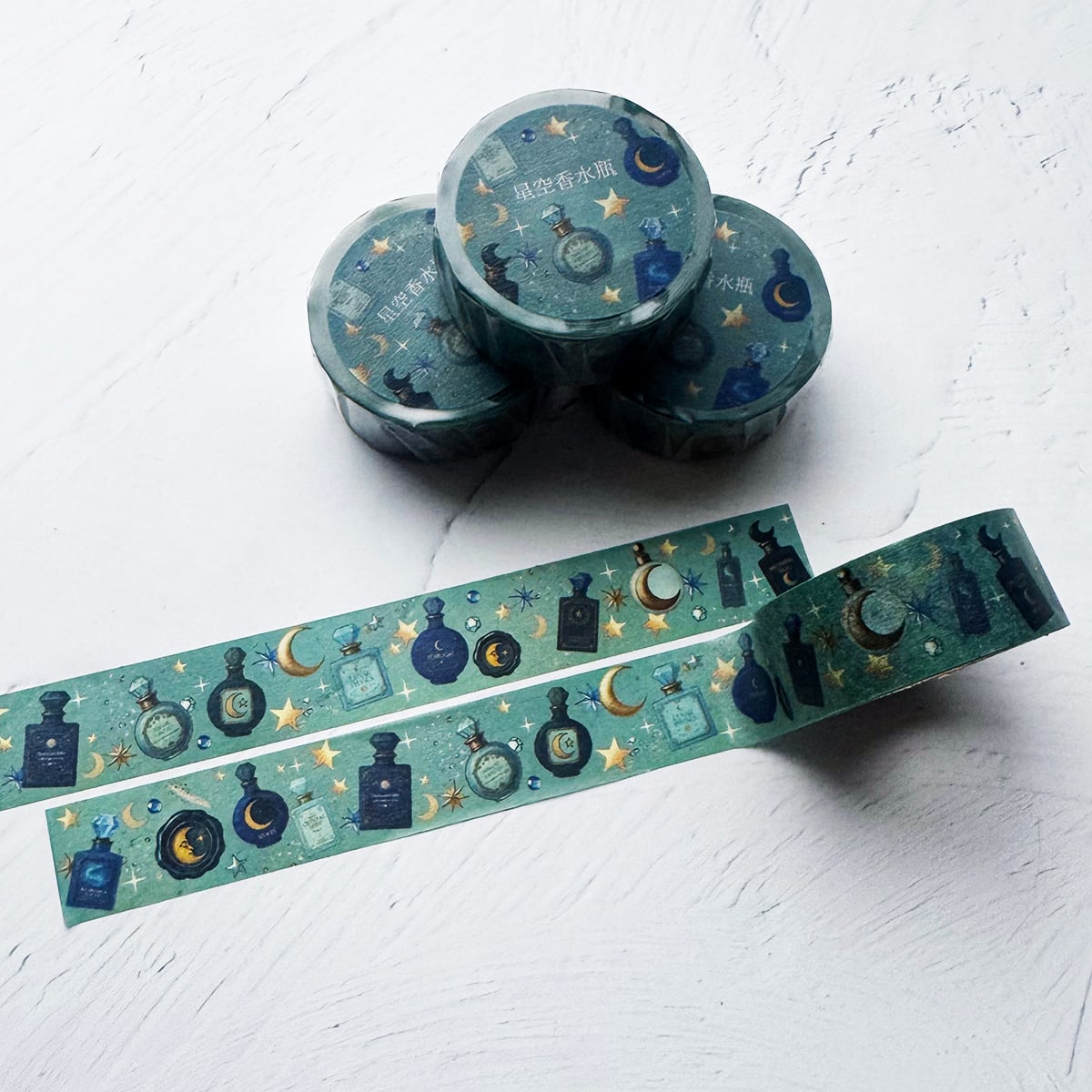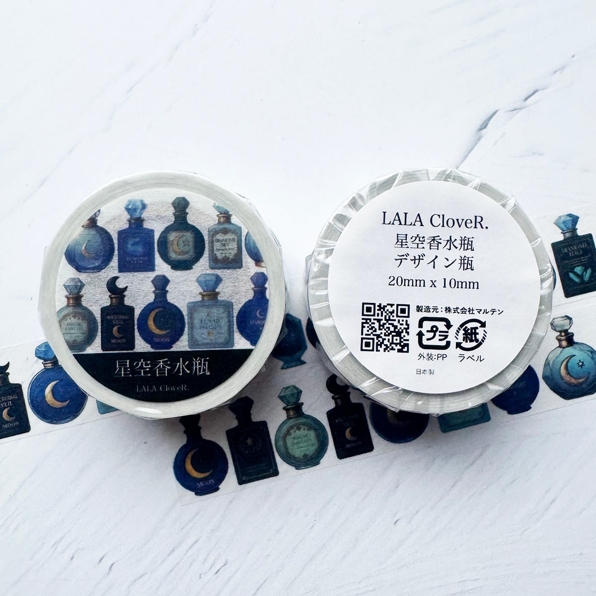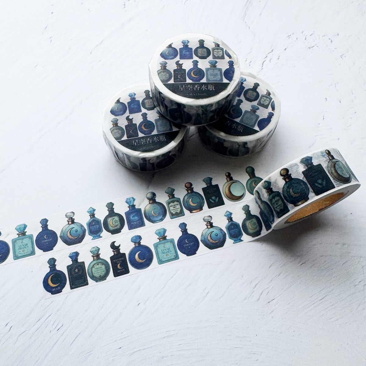 アンティーク香水瓶たち、星と月のモチーフなどを散りばめた総柄デザイン。