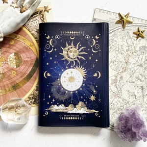 天体柄をモチーフに、月と太陽が描かれた架空の洋書のようなデザインのブックカバーです!