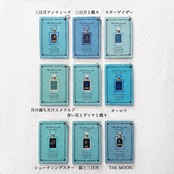 幻想的な香水瓶に貼られた、ラベルのデザインを主役にしたアップ柄。