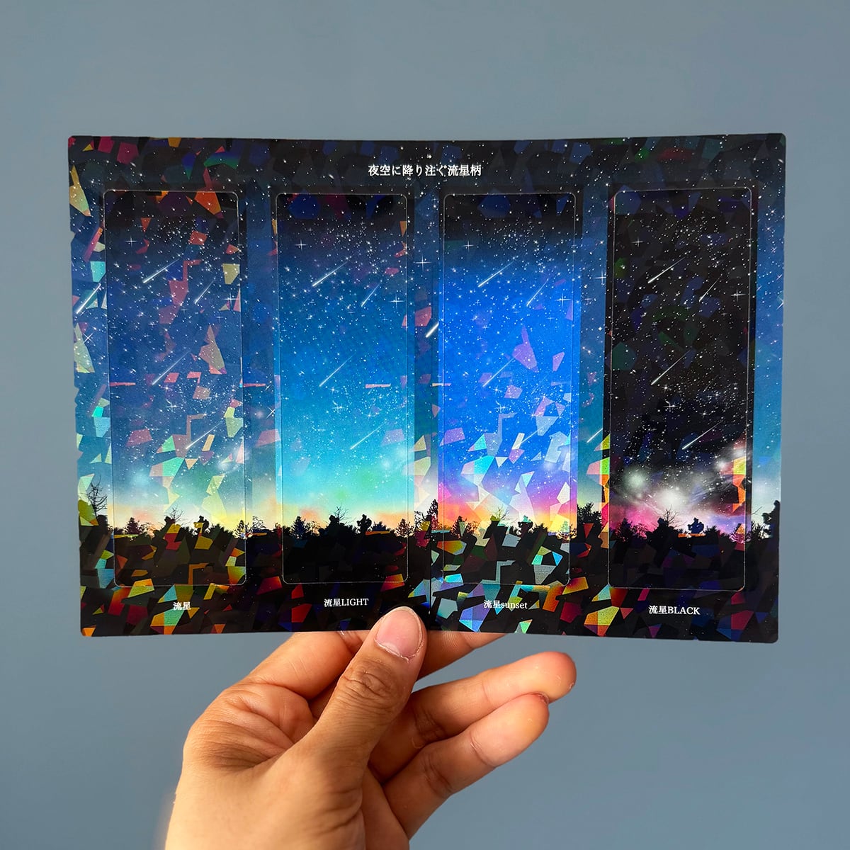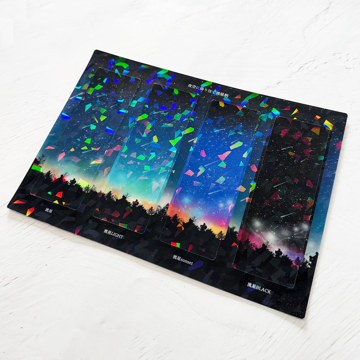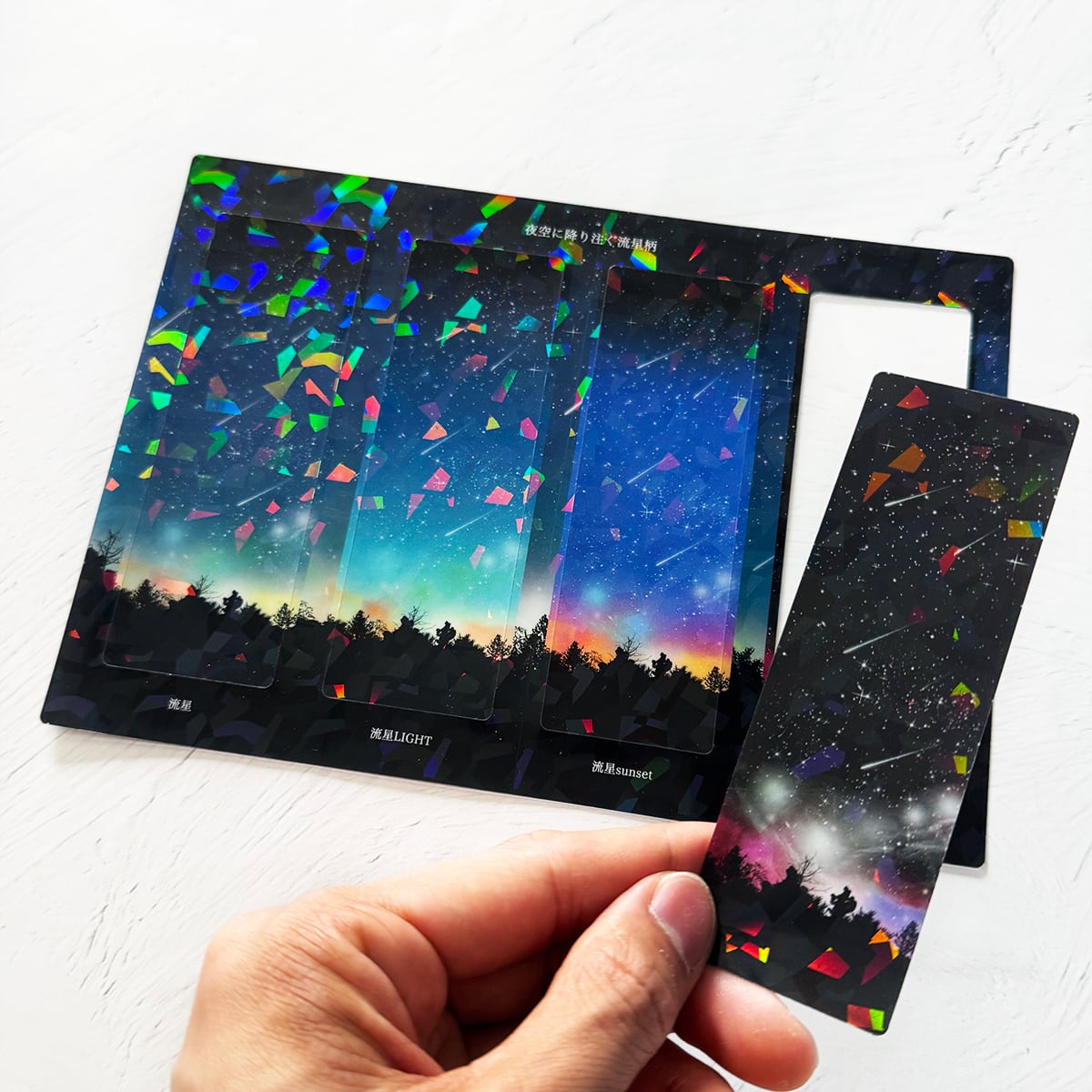 夜空に降り注ぐ流星柄を閉じ込めた、ホログラムしおりセット。