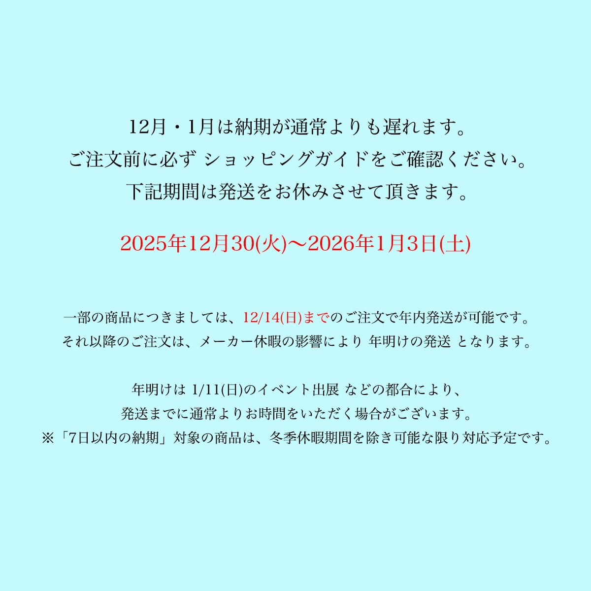 それ以降のご注文は、メーカー休暇の影響により 年明けの発送 となります。