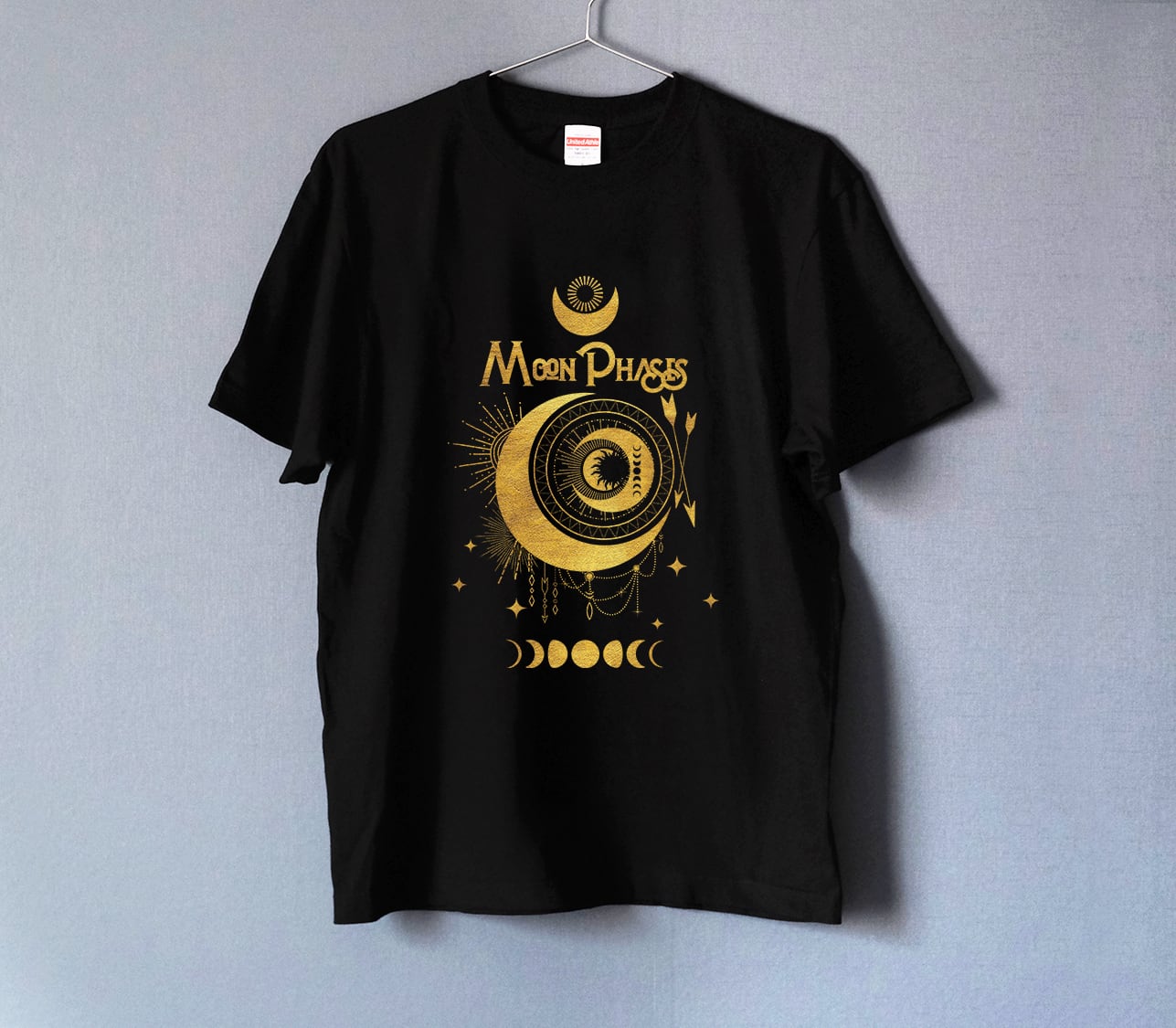 三日月が輝く月の満ち欠け Tシャツ ゴールド BLACK(men&women)
