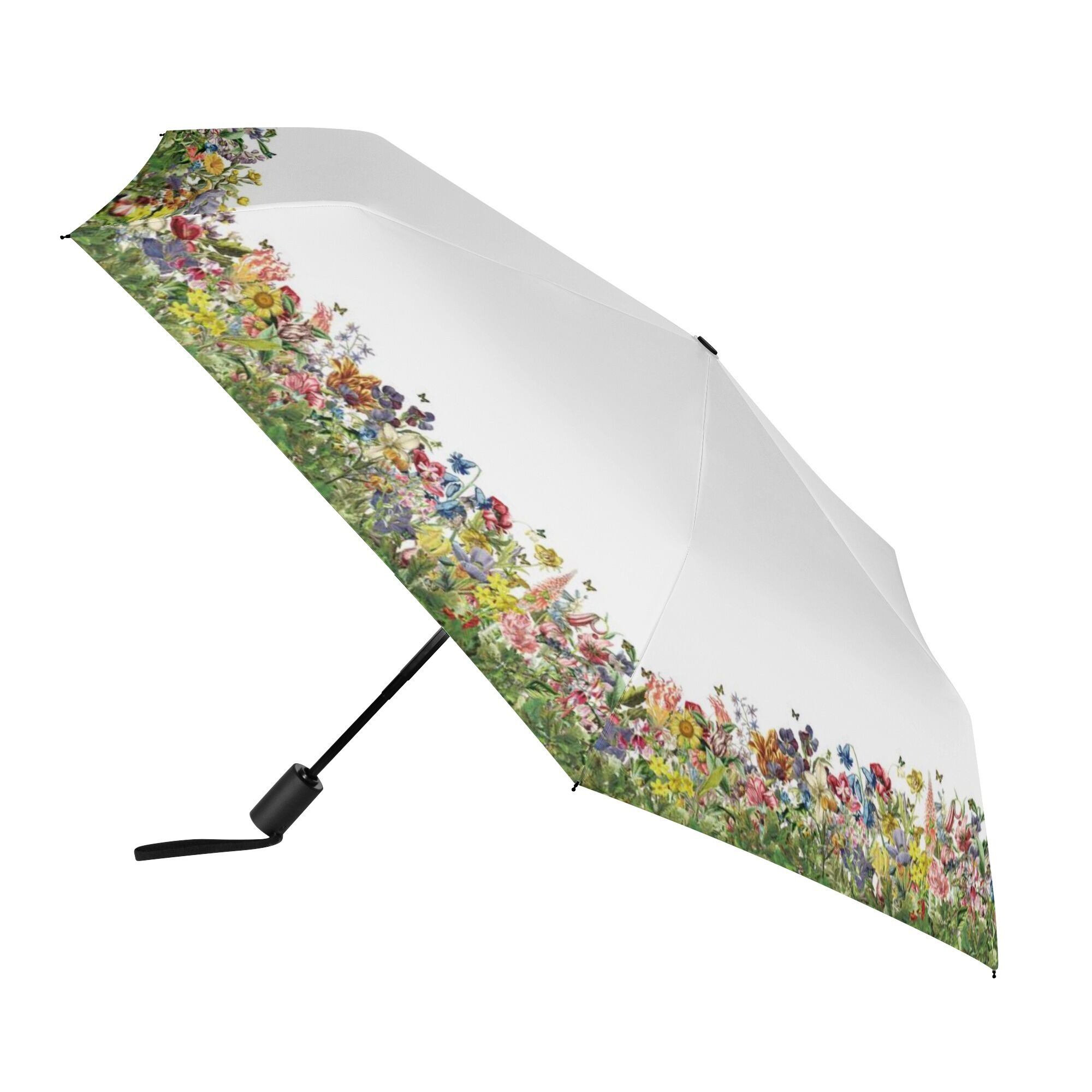 『花の楽園』をイメージした、ボタニカル柄の晴雨兼用折りたたみ傘・日傘です。